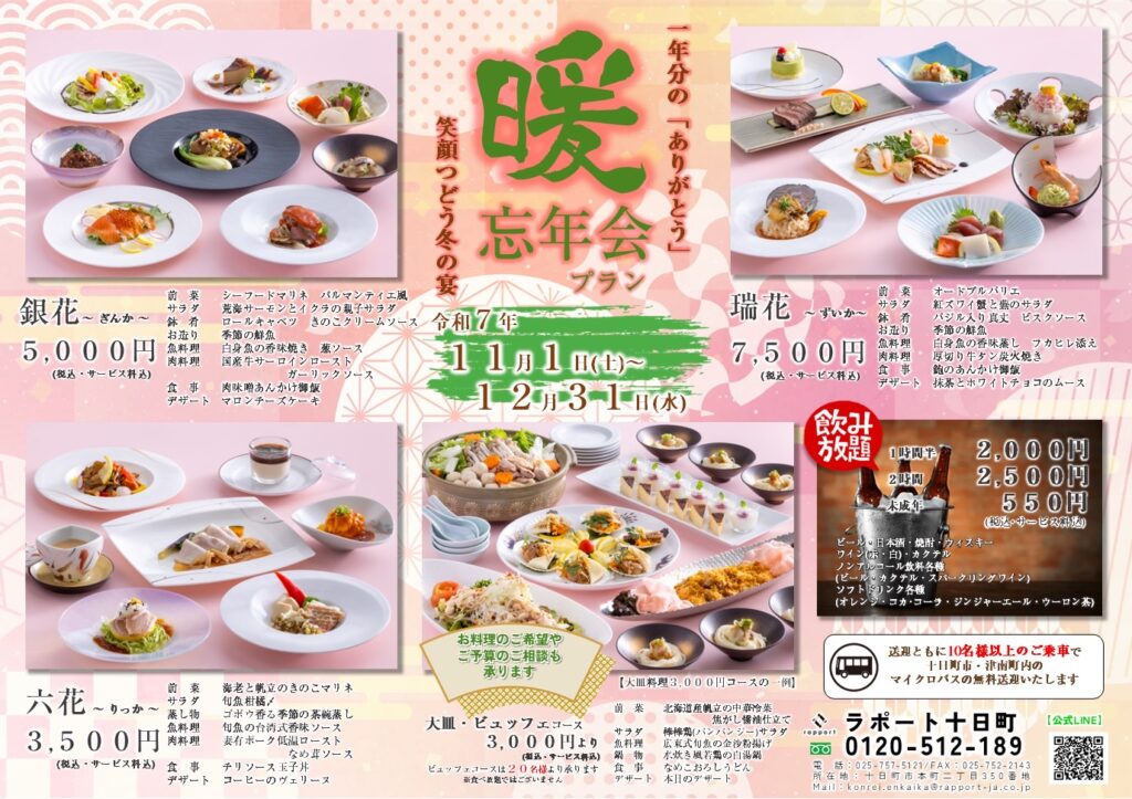 一年の労をねぎらう忘年会 みなさま今年1年お疲れ様でした!1年の労をねぎらう忘年会。今年も和洋中のシェフが心を込めて折衷料理をご用意いたしました。是非ご賞味ください!ラポート十日町では、くじの準備やビンゴ機の貸出など微力ながら幹事さんのお手伝いをさせていただいております(^^)幹事さんも一緒に労をねぎらいましょう! お問い合わせはこちらから LINEで問い合わせる 電話で問い合わせる